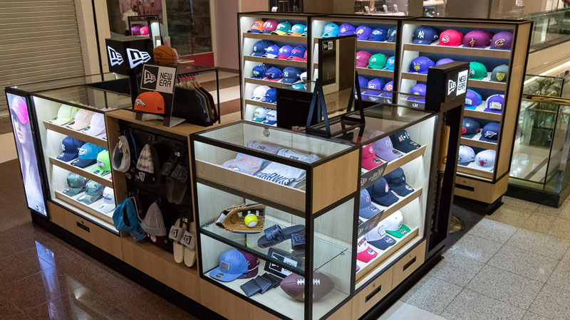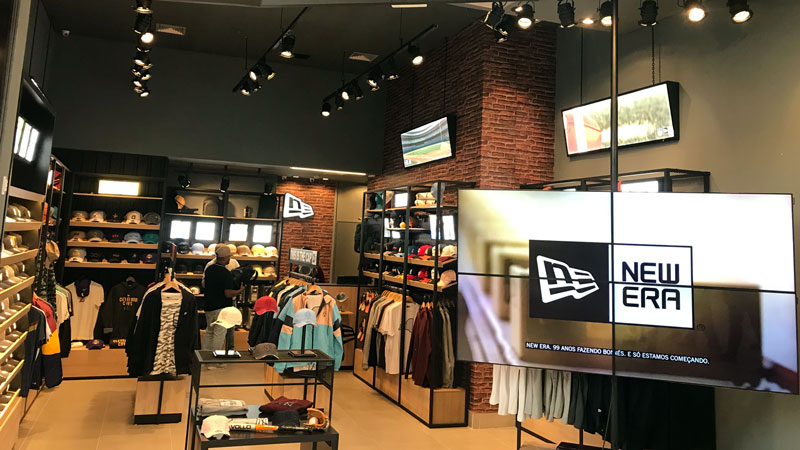 As lojas no Brasil oferecem a linha completa de bonés, vestuário e acessórios, trazendo ao consumidor o espírito dos campos, quadras, moda de rua, palcos e vitrines.